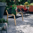 Une assise et un dossier en aluminium, des pieds en teck ; cette combinaison élégante illustre l’intérêt de Fermob pour le mariage des matières. Le métal coloré, champ de prédilection du fabricant, s’associe à la chaleur du bois et offre toute résistance aux conditions outdoor.