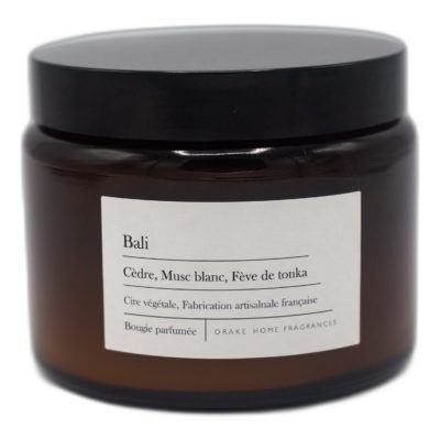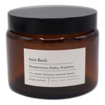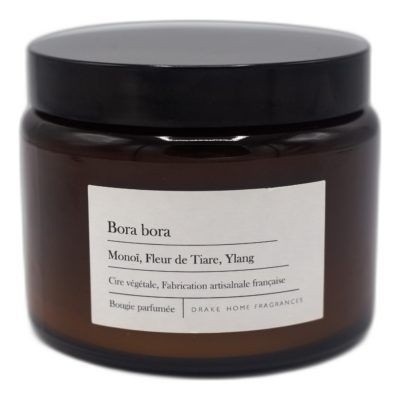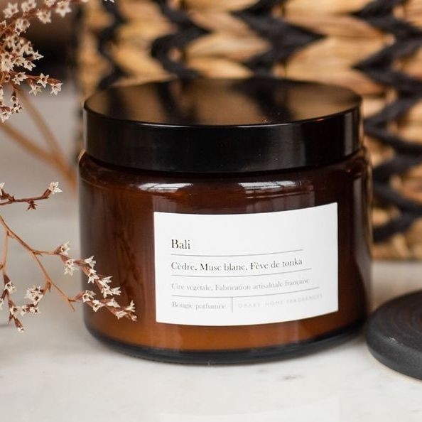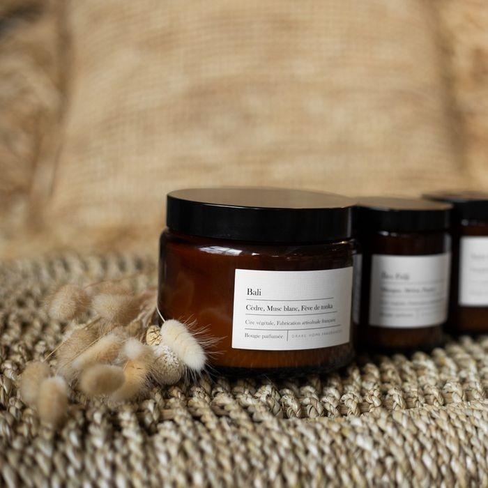De la cire végétale, des parfums naturels de Grasse et un pot en verre coloré.