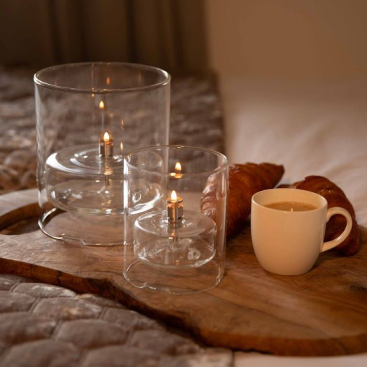 Un coupe-vent élégant pour l'intérieur et l'extérieur. Grâce à la conception du cylindre du pare-vent, il peut être placé à l'extérieur en cas de léger vent.