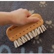 La brosse anti-peluches Redecker est une brosse très spéciale. Le caoutchouc naturel implanté manuellement se charge en électricité statique par frottement et attire les cheveux, peluches et poussières comme un aimant. Les particules de poussière adhèrent ainsi à la brosse et peuvent être facilement enlevées à la main ou sous l’eau courante.