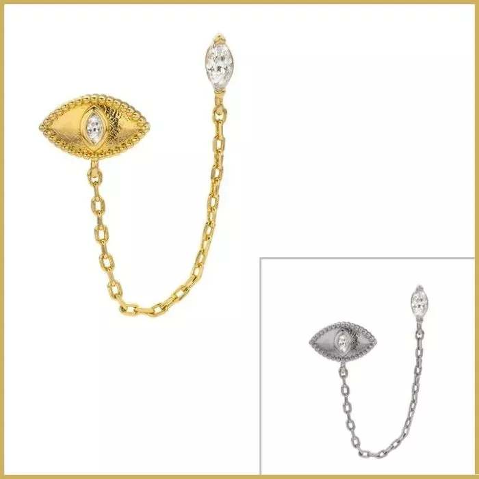 La boucle d’oreille Midnight de Mya-Bay joue avec le symbole de l’œil pour créer une ligne lumineuse unique, entre mystère et protection.