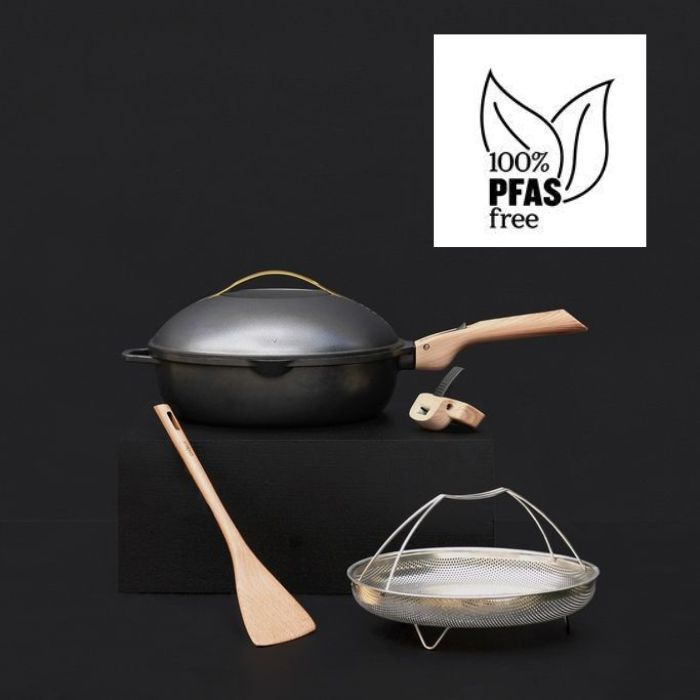 Gezonde, milieuvriendelijke materialen: 100% gerecycled aluminium en PFAS- en PTFE-vrije minerale coating.