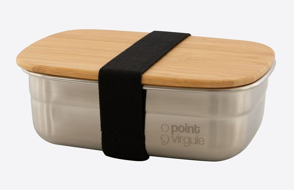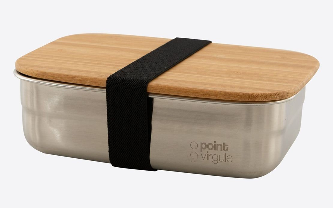 Dit roestvrijstalen lunchbox met bamboe-deksel is hermetisch dankzij de siliconen afdichting en het elastiek.