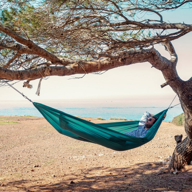 En hier is de uitzondering die de regel bevestigt: de Travel Set is de enige hangmat gemaakt van 100% polyester parachutestof die te koop wordt aangeboden door Camille & Co.