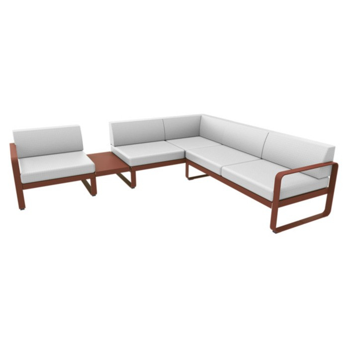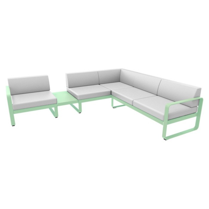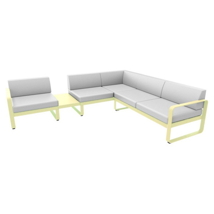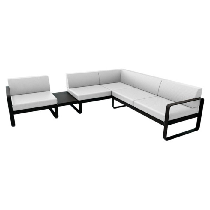 De Bellevie bank van de studio Pagnon en PelhaƮtre is een ruime design hoekbank die plaats biedt aan vijf of meer personen. Met zijn stevige aluminium frame en praktische verbindingsplank is hij ideaal voor feestjes.