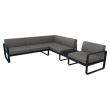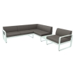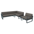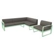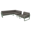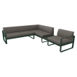 De Bellevie hoekbank van Fermob, ontworpen voor buitengebruik met een uniek ontwerp van de studio Pagnon en PelhaƮtre. De bank biedt plaats aan vijf personen en heeft een praktische plank voor het plaatsen van voorwerpen zoals drankjes of tijdschriften.