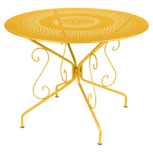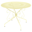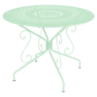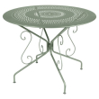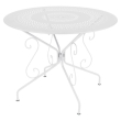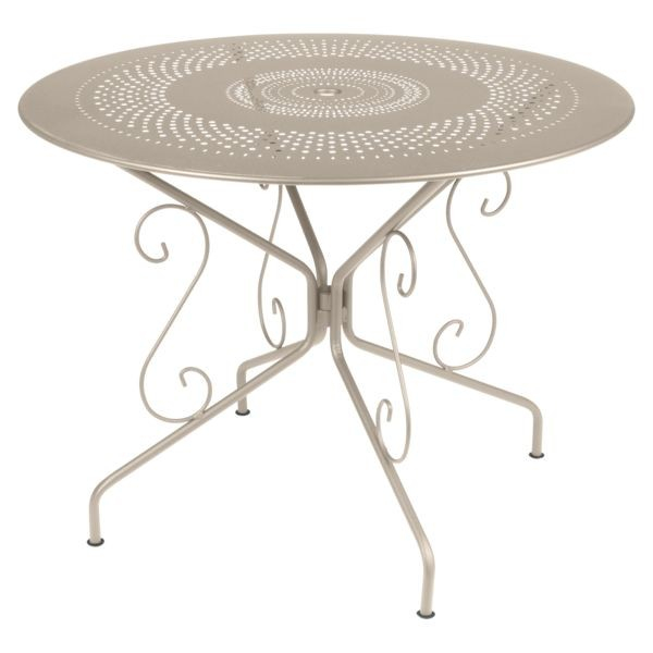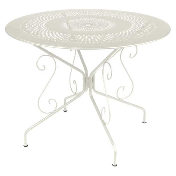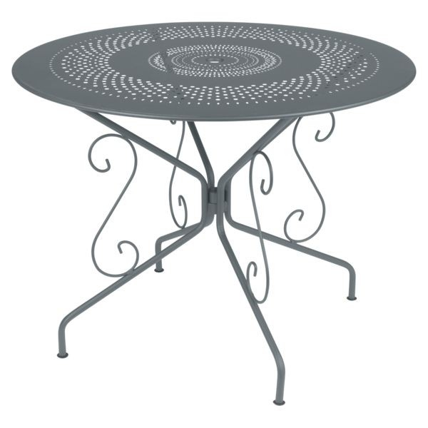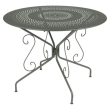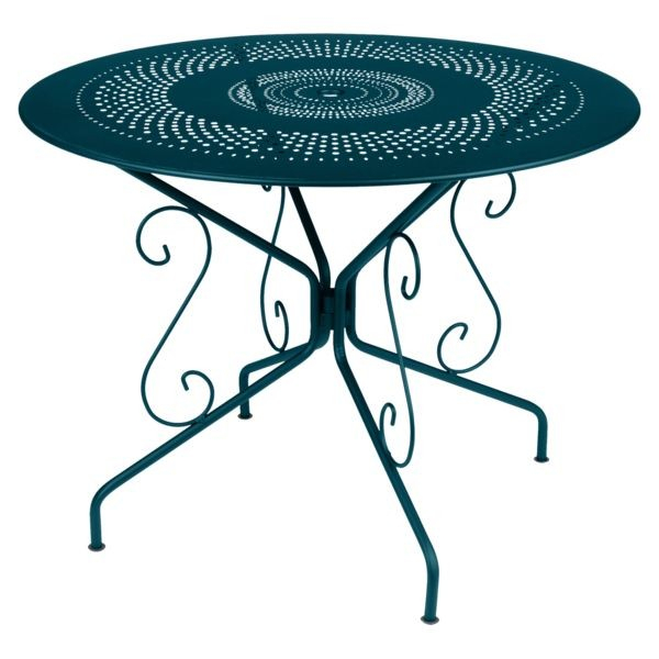 Het tafelblad is versierd met subtiele perforaties en de tafel is versierd met krullen die hem een elegante en aantrekkelijke uitstraling geven. De tafel is bestemd om te worden gebruikt voor ontspanning en gezelligheid in de open lucht.