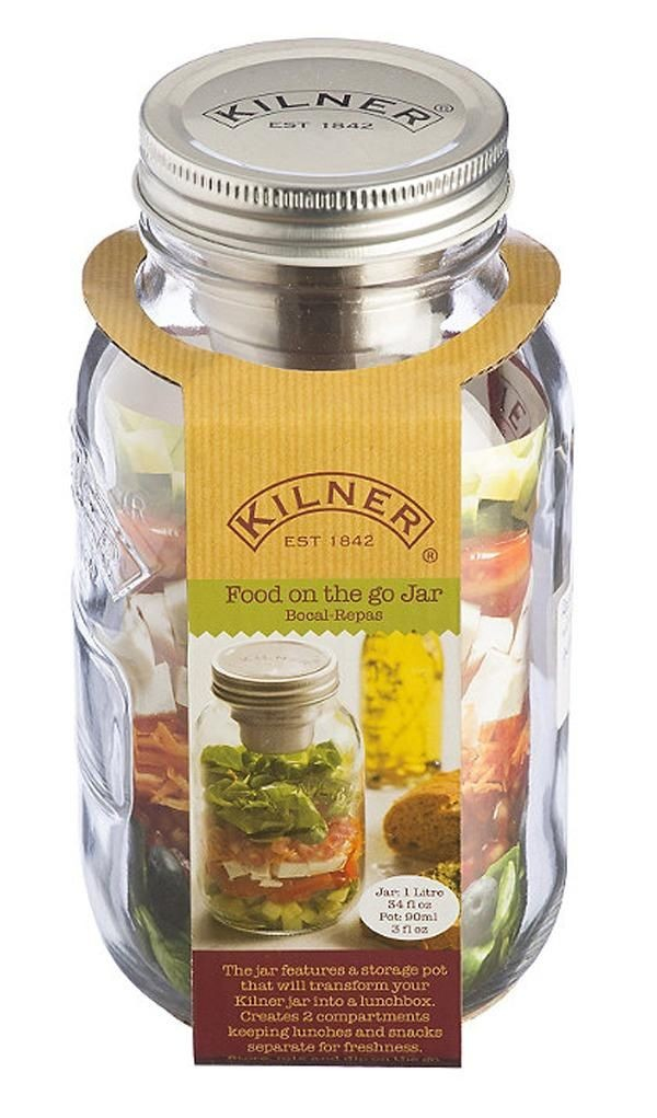 De Kilner Food on the Go Jar, een glazen en roestvrijstalen pot van 1000 ml, is perfect om gezonde zelfgemaakte maaltijden in te bewaren. Hij is vaatwasmachinebestendig en geschikt voor de magnetron!