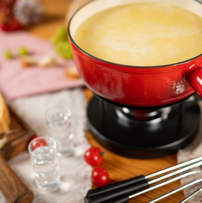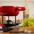 De gietijzeren fonduepot maakt indruk met zijn uitstekende vermogen om warmte te verspreiden en op te slaan.