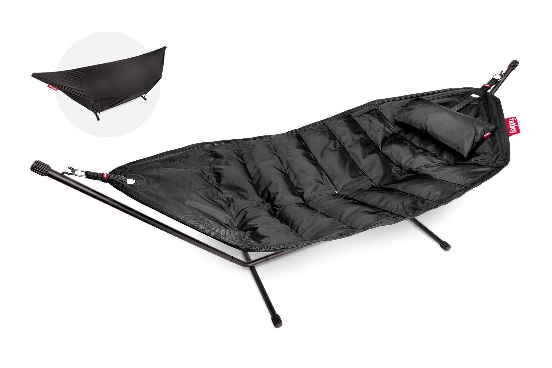 De Fatboy Headdemock is een grote luxe hangmat voor wel twee personen (of max. 150 kg). Je bent niet langer afhankelijk van een touw en een boom. De Headdemock is namelijk een vernieuwende hangmat die verouderde gebreken tackelt.