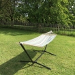 De Jamaica Set is een complete set bestaande uit een hangmatstandaard en een hangmat. De hangmatstandaard is zeer eenvoudig te monteren en te demonteren dankzij de 8 vleugels die je gewoon hoeft te schroeven of los te schroeven: montagetijd = 5 minuten. Er wordt een compacte draagtas meegeleverd, zodat u deze gemakkelijk kunt meenemen.
