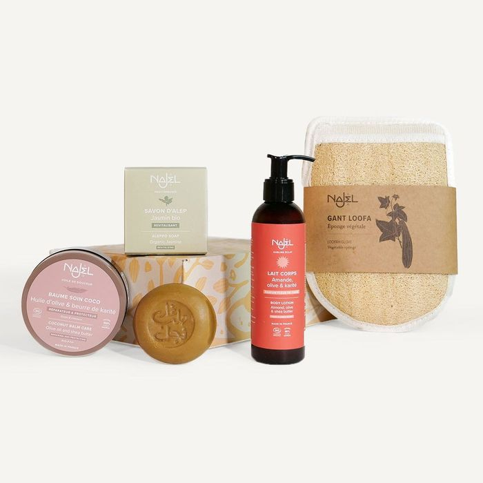 Een zachte set voor de winter: kokosbalsem, Tiaré-melk, Aleppo-zeep met jasmijn en luffahandschoen om de huid zachtjes te voeden, te hydrateren en te troosten.