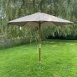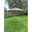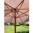 Een zeer klassieke maar effectieve houten mast parasol, 300 cm in diameter, in een taupekleur.