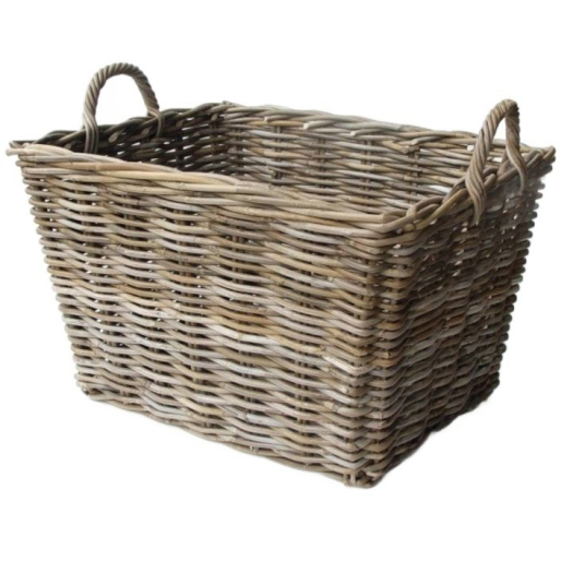 Een grote grijze rotan mand met hengsels: ideaal om bijvoorbeeld je plaids in op te bergen.