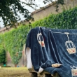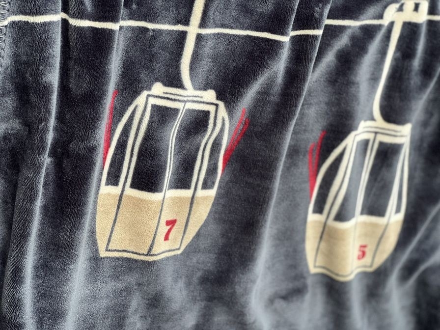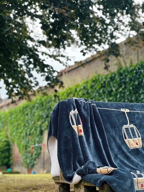 Verdubbel de zachtheid en warmte met deze dubbellaagse plaid: in totaal 630 gram per vierkante meter. Het is een tweekleurige plaid: aan de ene kant blauw met telecabine motieven en aan de andere kant wit. Het is gemaakt van 100% gerecyclede vezels.